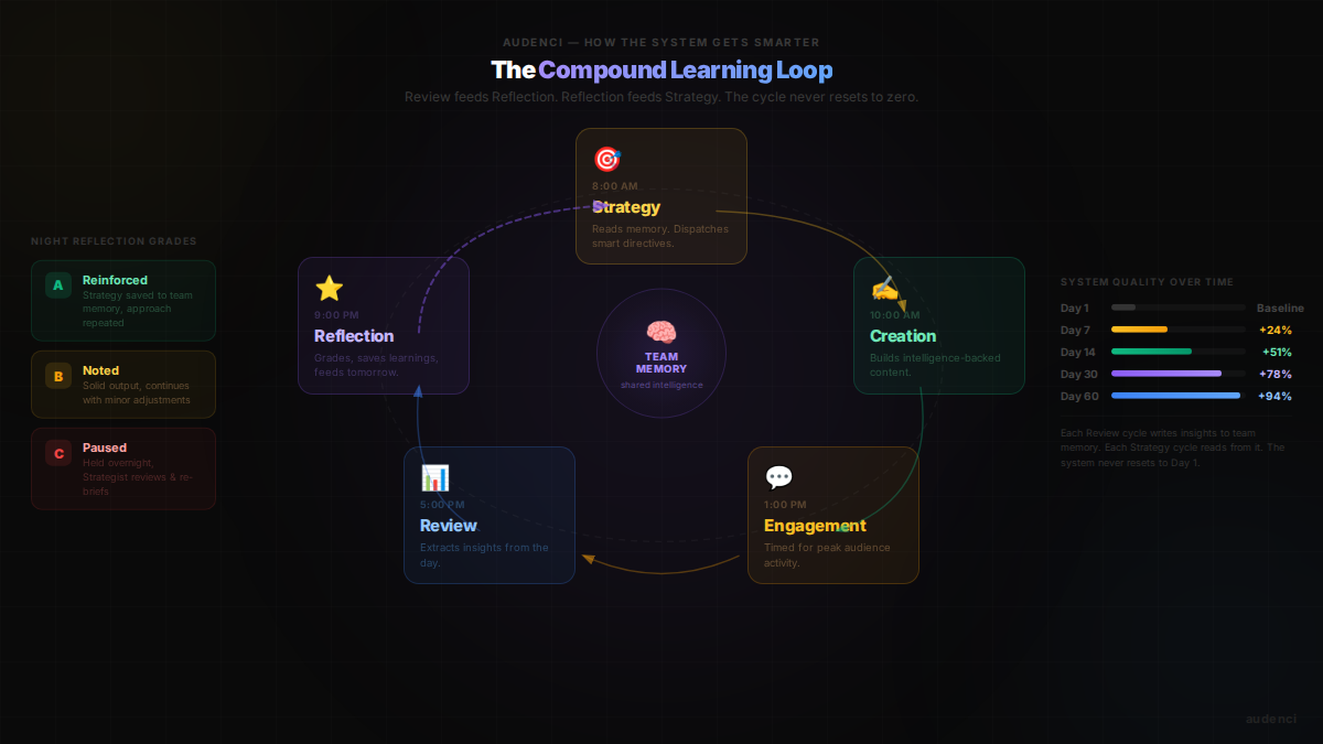 On Day 1, Audenci runs the 5-Cycle System with your brand context and a blank memory. It performs well — better than most solo marketers managing everything manually — but it's working from generic intelligence.