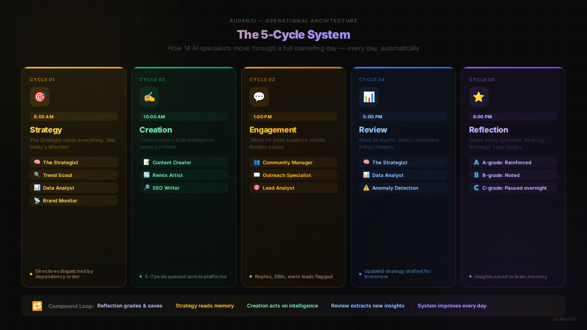 Audenci runs it every single day, automatically, across all 14 AI specialists on your team. Here's what happens in each cycle.