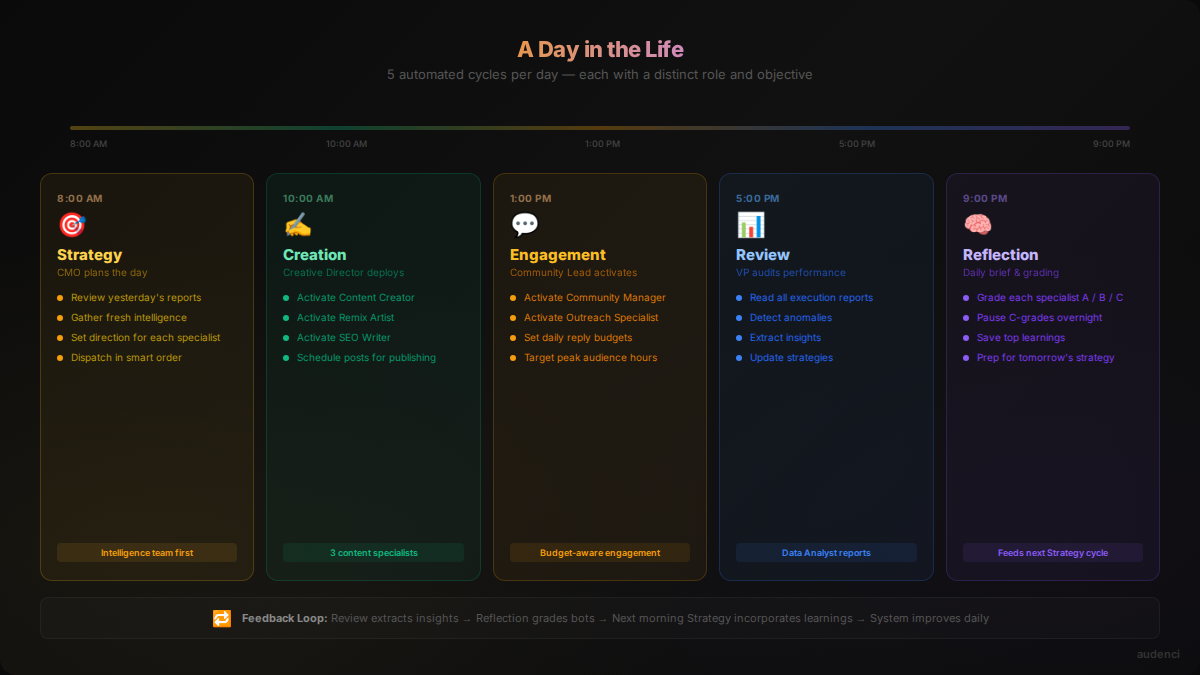 Night - Reflection. Grade every specialist's performance (A, B, or C). Pause underperformers overnight so they don't waste resources. Save the day's top learnings to team memory.