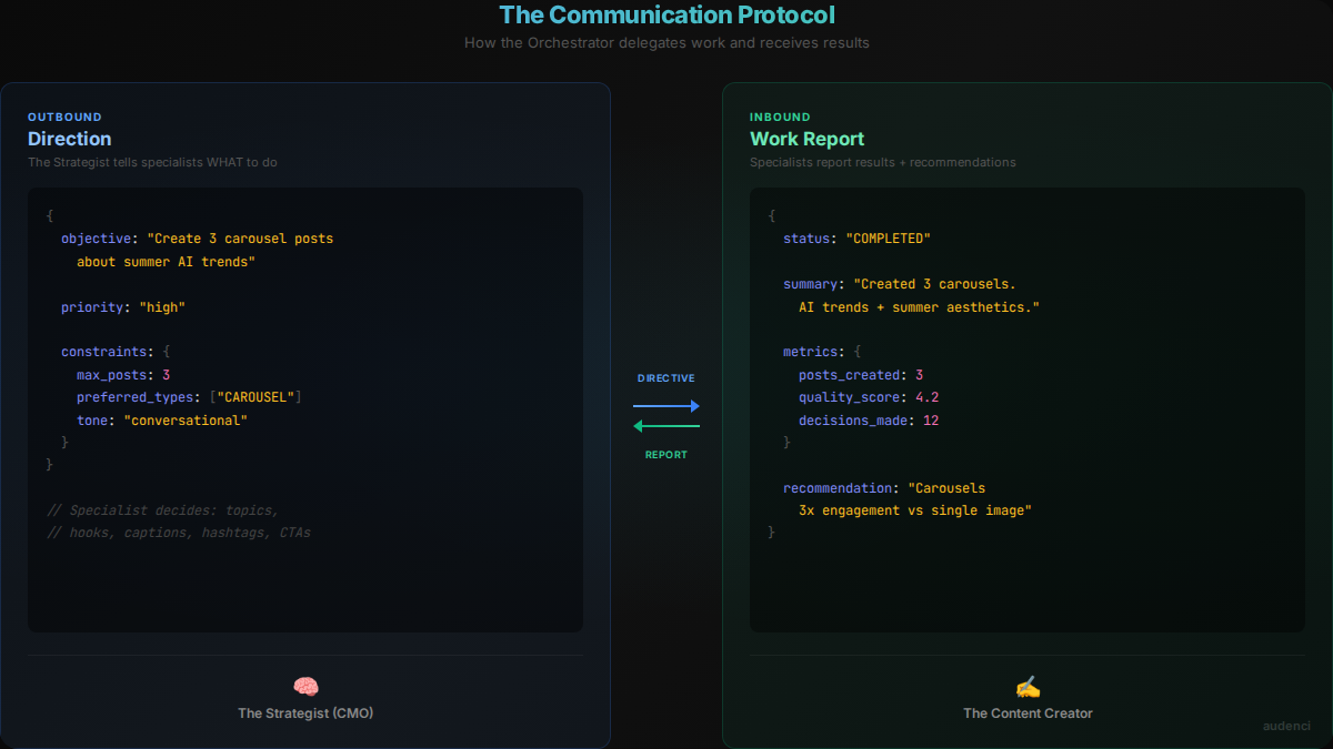 Remove this constraint and the whole system falls apart. The Strategist starts writing mediocre captions instead of delegating to The Content Creator. It tries to reply to comments instead of dispatching The Community Manager. It becomes one overwhelmed generalist - exactly the problem we were trying to solve.
