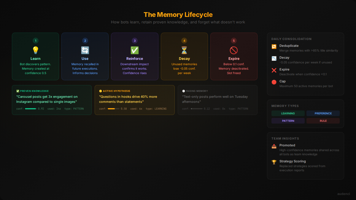 A memory might be: "Carousel posts get 3x engagement on Instagram" (high confidence, used 24 times, proven). Or: "Questions in hooks drive more comments than statements" (medium confidence, still being validated). Or: "Text-only posts work on Tuesday afternoons" (low confidence, fading because it hasn't been confirmed).