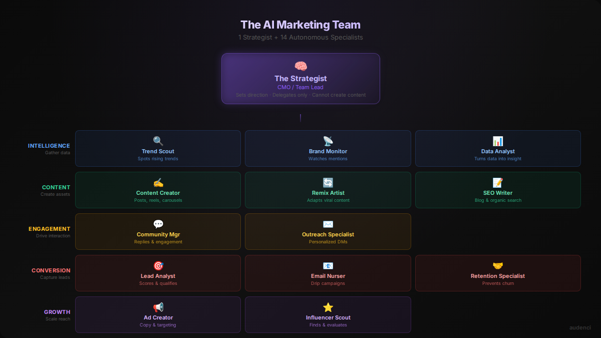 An AI marketing team is not a chatbot. It is not a single AI assistant that answers marketing questions. It is a team of AI specialists organized exactly like a real marketing department.