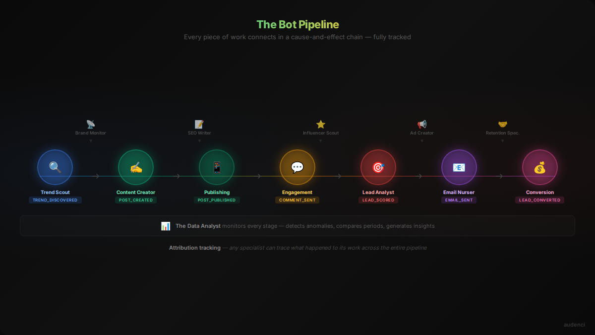 Every piece of work in Audenci is connected in a cause-and-effect chain: trend discovered → post created → comment sent → lead scored → email sent. Each step is recorded.