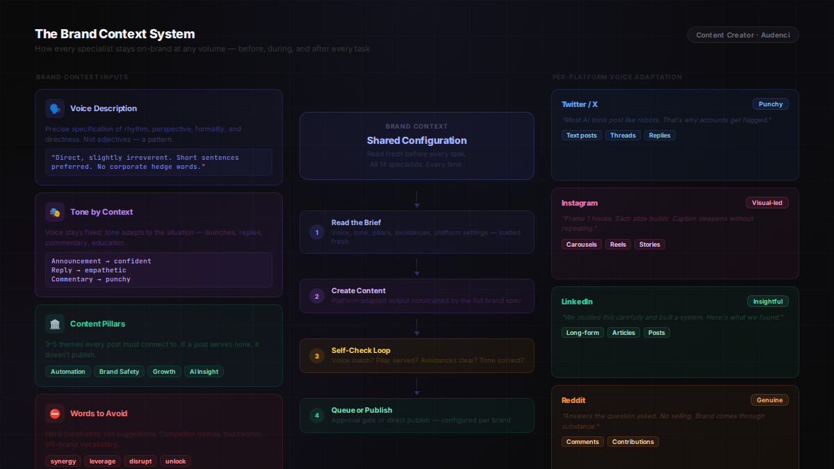 Audenci's architecture inverts this. Brand context isn't something you paste into a prompt. It's a structured configuration that runs before every task, as a constraint on every output, enforced by a self-check after every generation.