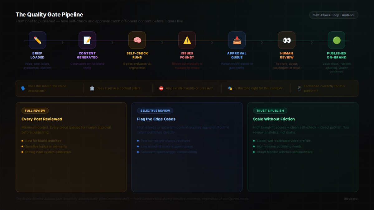 This is the loop that catches the drift that happens at scale. The subtle things: a slightly wrong register, a word that doesn't quite fit the brand's vocabulary, a post that's technically correct but doesn't feel like the brand.
