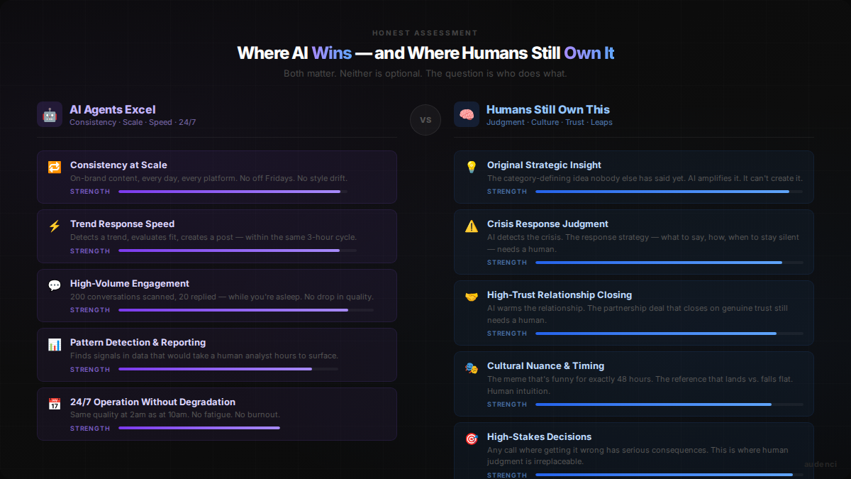 Humans own everything that requires genuine creative leaps, cultural intuition, crisis judgment, and closing high-trust relationships. That's a smaller slice — but it's the highest-leverage slice.