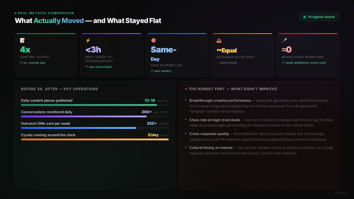 Content output volume: 3-4x increase. Not because we wanted more posts — because the team could now cover every platform, every day, without dropping any.